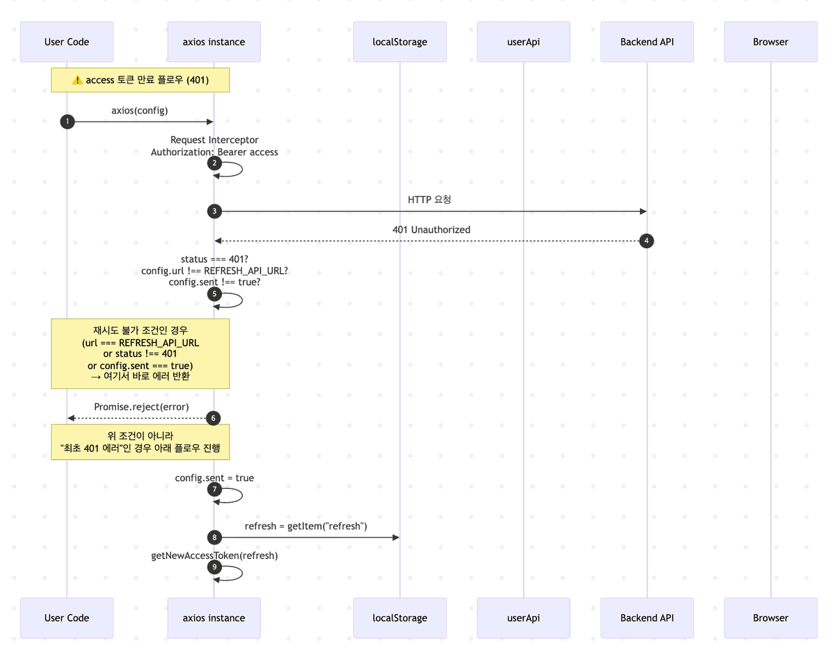 config.url === REFRESH_API_URL: refresh 요청에서 에러가 났다면 refresh 토큰이 만료되었거나 혹은 서버가 터진 것이다.status !== 401: 에러코드가 200, 300, 500, 404 등 인증만료 코드가 아닌 곳에서의 에러인데 이는 각 상황에 맞는 에러처리를 해야 한다.config.sent===true: 무한루프 방지 플래그