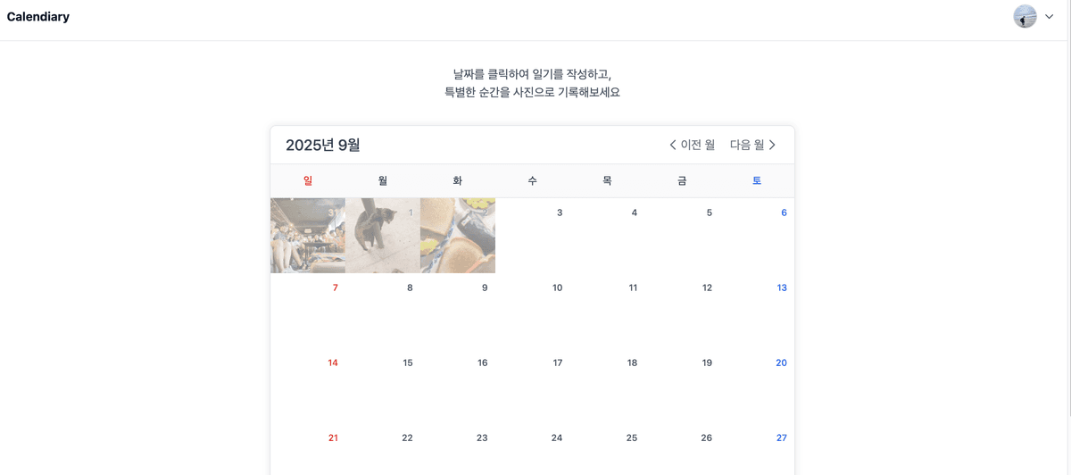 • 유저는 캘린더의 각 날짜를 클릭하여 텍스트와 이미지 업로드를 통해 일기를 작성 할 수 있다.